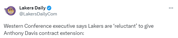 一位西部匿名高管透露,湖人和浓眉的续约事宜已经被搁置了,湖人把这放在次要地位,目前湖人不愿意和浓眉提前续约;该高管还表示浓眉的伤病史是湖人拒绝提前续约的部分原因:湖人想要看看浓眉能否保持健康,他们也想看看詹姆斯接下来会做什么。