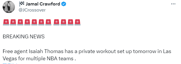 来源:JRS直播网07-10 12:26JRS直播网讯07月10日,前NBA超级第六人贾马尔-克劳福德透露,自由球员以赛亚-托马斯明天将在拉斯维加斯为多支NBA球队试训,很明显,34岁小刺客仍旧想要重返NBA。