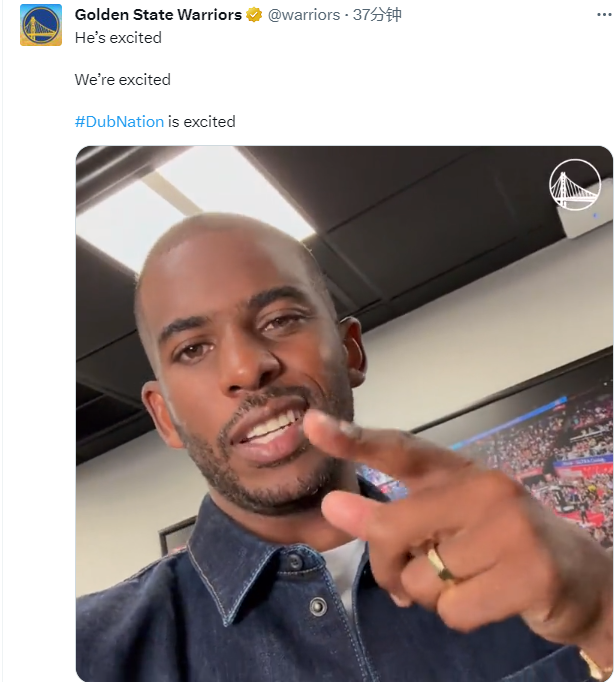 勇士官推转发视频并且写道:他很兴奋,我们很兴奋,整个勇士国度都很兴奋。