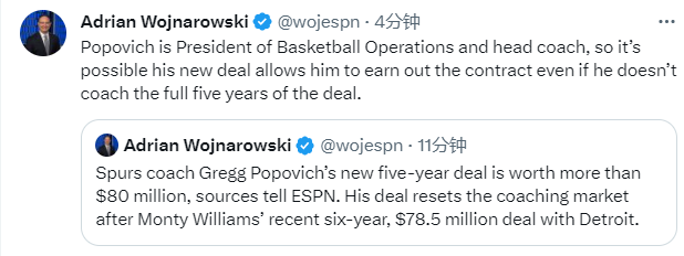 espn名记woj报道,波波维奇和马刺续签5年超8000万美元大合同,打破纪录创造NBA历史新的最大教练合同,此前蒙蒂和活塞打成6年7850万美元执教合同。