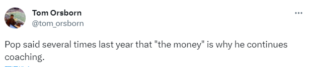 为何波波维奇74岁了还续约继续执教马刺,马刺记者Tom Orsborn表示,波波维奇上赛季多次表示钱是他继续执教的原因。