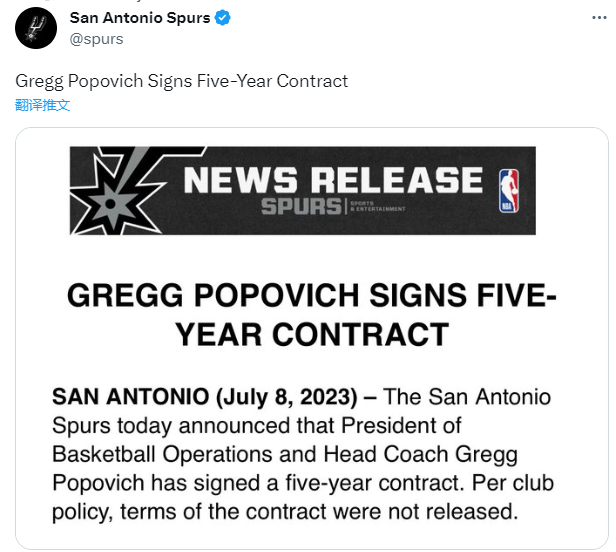 圣安东尼奥马刺队突然官宣,球队已经和波波维奇续签5年合同。