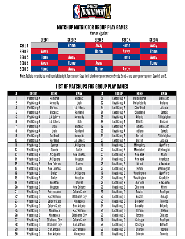 具体规则如下:30支球队全部参赛,分成6个小组,东西部各3个小组,每个小组5支球队,8支球队将晋级淘汰赛。小组赛阶段(11月4日至28日的周三和周六),每支球队将和小组其余4支球队各打一场,包括两个主场与两个客场。6支小组第一球队,外加两支外卡球队(成绩最好的小组第二)晋级八强进入淘汰轮。