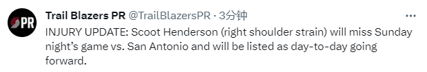 来源:JRS直播网07-09 12:09JRS直播网讯07月09日波特兰开拓者官方更新斯库特-亨德森的伤情,亨德森的右肩扭伤,将缺席下周一与马刺的比赛,进入球队每日观察名单,探花亨德森无缘下一场大战状元文班亚马;火箭4号秀更惨,脚踝二级扭伤,预计夏联报销。