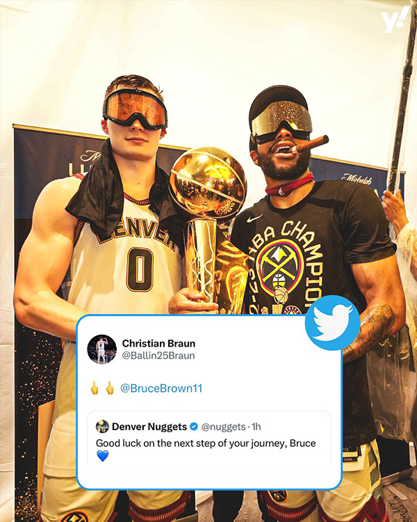 布鲁斯-布朗正式离开掘金,掘金官方晒布朗抱着总冠军奖杯的定妆照,配文写道:祝你在下一个旅程中一帆风顺,布鲁斯。