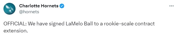 黄蜂官方宣布,球队正式和全明星后卫拉梅洛-鲍尔签下一份提前续约合同,这是一份最高5年2.6亿美元的顶薪(指定新秀条款)合同。