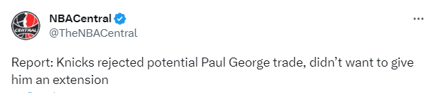 尼克斯记者Alan Hahn透露,今年休赛期尼克斯有机会得到保罗-乔治,但他们认为为乔治放弃一揽子的计划太贵了,他们不想这样做;尼克斯和快船谈判过,快船给出了要价,而且乔治表示:我想要续约,尼克斯不想和他立即续约,然后谈判就结束了,目前乔治已经不在尼克斯的考虑范围内了。