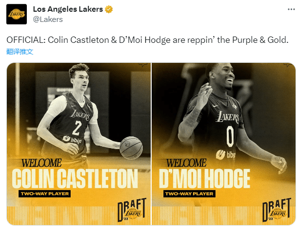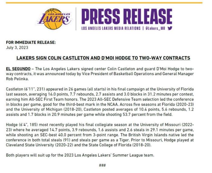 为了夏季联赛,湖人官方正式宣布签下德莫伊-霍奇、科林-卡斯尔顿。