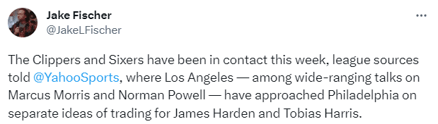 快船队已经行动了,名记Jake Fischer透露,快船和76人已经在本周就小莫里斯和鲍威尔等筹码交换哈登和托拜亚斯-哈里斯的交易想法进行了接触。