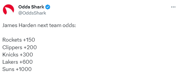 目前哈登下家最新赔率出炉,火箭+150位居榜首,快船+200排在第二位,尼克斯+300、湖人+600和太阳+1000,湖人在列。