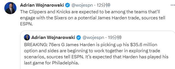 本来外界都一致认为哈登将跳出合同并且与76人续约,可在球员选项截止日,哈登决定执行球员选项并和76人商讨交易,哈登尝试离队,Woj直言:预计他已经打完了76人生涯的最后一场比赛。