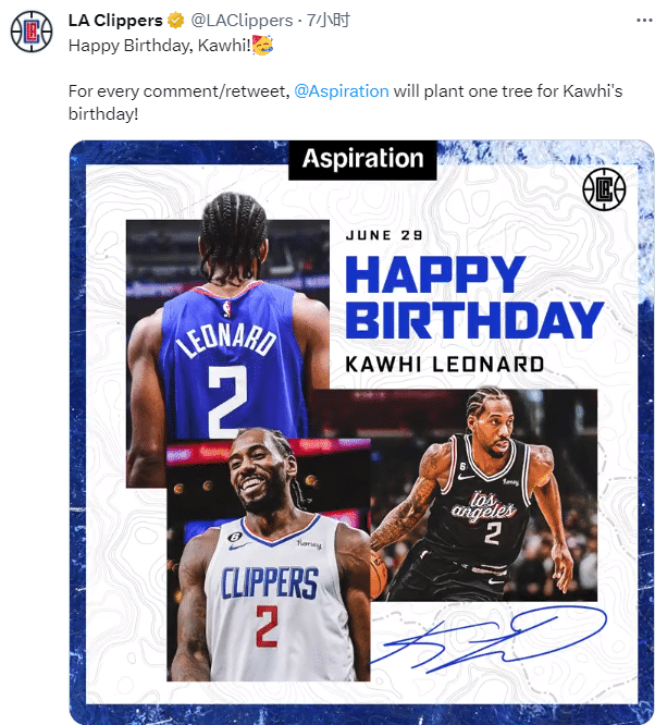 快船官方祝贺小卡生日快乐,并且发推表示每增加一人点赞或者转发小卡生日动态,球队就在地球上多种一棵树;NBA官方也祝贺小卡。