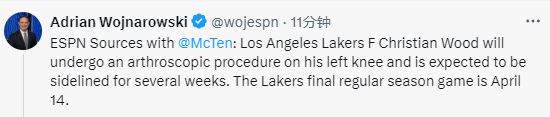 来源:JRS直播网03-19 11:51JRS直播网03月19日,湖人内线球员伍德的伤情更新,据espn名记woj报道,伍德将接受左膝关节镜手术,预计缺阵数周。