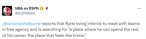 Ramona Shelburne则表示:欧文有望重返达拉斯独行侠,但他计划与其他球队会面,他想为自己余下的NBA生涯找到一个“像家一样的地方”;对于像凯里这样的人来说,这是一件有趣的事情,他成为自由球员,但他并不能真正确定达拉斯小牛队会给他五年顶薪合同(最高5年2.73亿美元)。