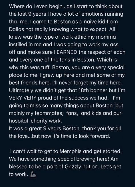 “这是一个伟大的9年,波士顿,谢谢你给予的所有爱……但现在是时候向前看了”。