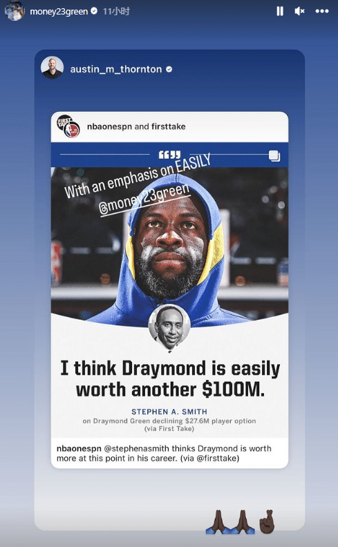 追梦转发A-史密斯言论并配上“双手合十和数钱”的表情。