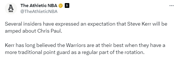 一些内部人士表示预计科尔会对克里斯-保罗感到兴奋。 科尔长期以来一直相信,当勇士队拥有一名更传统的控球后卫作为轮换阵容的一部分时,他们才能处于最佳状态。