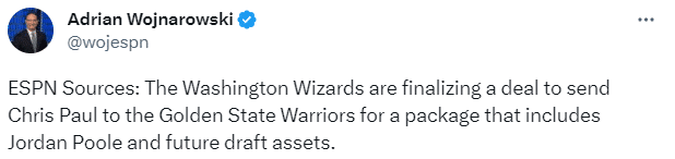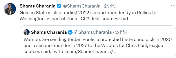 据两大名记Woj和shams报道,保罗被交易至勇士,奇才得到普尔与若干选秀资产;Shams跟进报道,勇士送出了普尔、瑞安-罗林斯、2030年受保护首轮与2027年次轮选秀权。