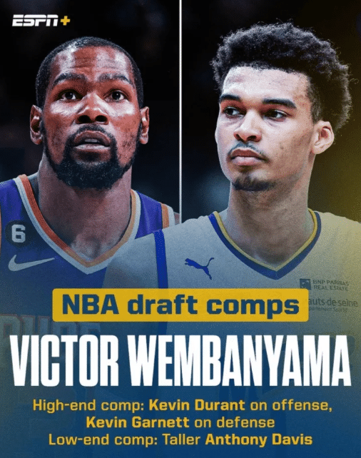 文班亚马的选秀模板——上限:进攻端杜兰特,防守端加内特;下限:身高更高的安东尼-戴维斯。