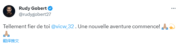 同样来自法国的戈贝尔发推祝贺文班亚马:“为你感到骄傲@文班亚马,新的冒险开始了!