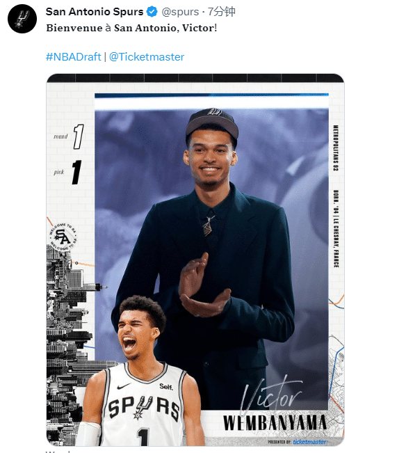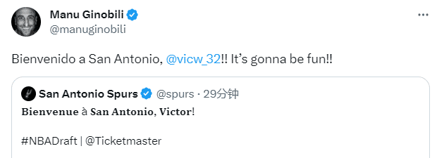 文班亚马当选状元引热议,马刺传奇马努-吉诺比利发推:“欢迎来到圣安东尼奥马刺@文班亚马!!这将会很有趣!!