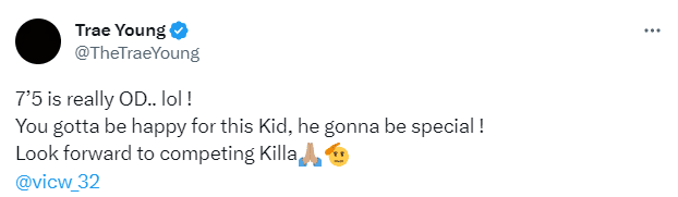 老鹰球星特雷-杨发推:“7尺5寸真的好高!!你要为这孩子感到高兴,他将会变得非常特别!期待和文班亚马交手
