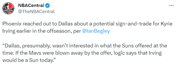 纽约记者Ian Begley报道:太阳在休赛期早些时候与独行侠取得了联系,想通过先签后换得到欧文。据推测,独行侠当时对太阳开出的报价并不感兴趣,否则现在欧文已经在太阳队阵中了。