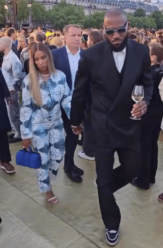 38岁詹姆斯戴着墨镜、身穿一套黑色西装,牵着爱妻萨瓦娜的手参加巴黎时装周,另一只手则端着美酒;之后詹姆斯和友人拥抱寒暄。