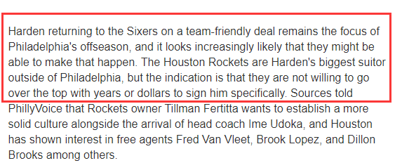 据费城记者Kyle Neubeck报道,哈登以一份对球队友好的合同回到76人仍是费城球队休赛期的焦点,看起来他们越发可能实现这一目标。火箭仍是费城之外哈登最大的追求者,但有迹象表明,他们不愿意用多年合同或过高的薪资签回哈登。
