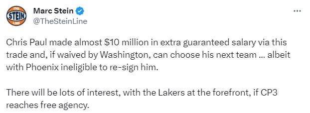 据名记Marc Stein报道,克里斯-保罗通过这笔交易获得了近 1000 万美元的额外保障薪水(保障金额从1580万美元增加到至少2500万美元),如果被华盛顿裁掉他可以选择加盟下一支球队;菲尼克斯太阳已经没有资格重新签下他, 如果CP3成为自由球员,湖人将领跑保罗争夺战。