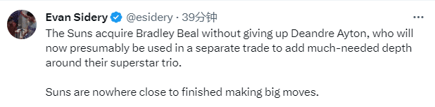 据Evan Sidery报道,太阳在没有送走艾顿的情况下得到比尔,接下来他们将继续兜售艾顿,为三巨头冲击总冠军增加阵容的深度,太阳离完成大动作还差得很远。