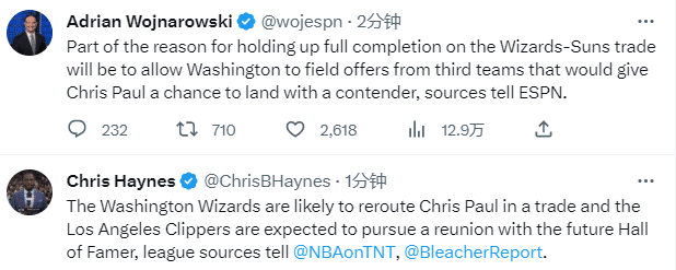 Josh Robbins报道,奇才管理层想要保罗,不过如果保罗想要加入一支具有竞争力的球队,奇才和太阳可能寻求三方交易,海耶斯进一步报道,快船有意加入三方交易追求保罗。