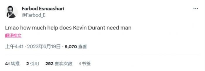 快船随队记者Farbod Esnaashari随后发推吐槽道:“笑死个人,杜兰特到底需要多少帮助?