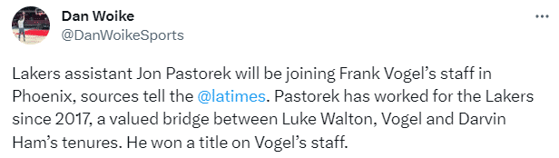 自2017年以来,帕斯托雷克就在湖人工作,他和卢克-沃顿、沃格尔以及哈姆都共事过,沃格尔执教湖人时期,他随队夺得一个总冠军。