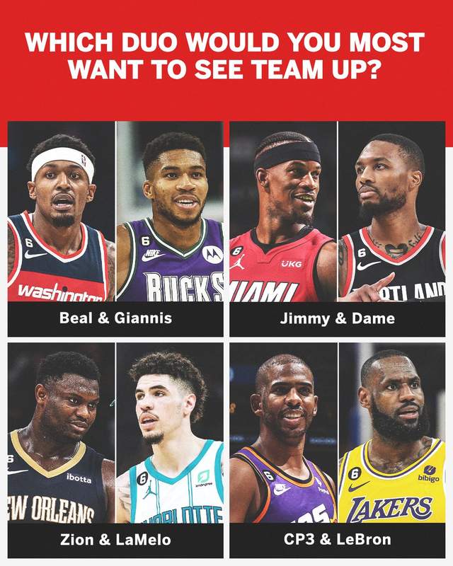 来源:JRS直播网06-17 12:46JRS直播网讯06月17日,ESPN发布了一组照片,暗示在今年夏天可能出现的4大巨星换队。他们分别是字母哥+比尔,巴特勒+利拉德,锡安+鲍尔,保罗+詹姆斯。那么这4组双巨头组合,最终是否有机会成行呢?如果最终成行,搭配效果又是如何?