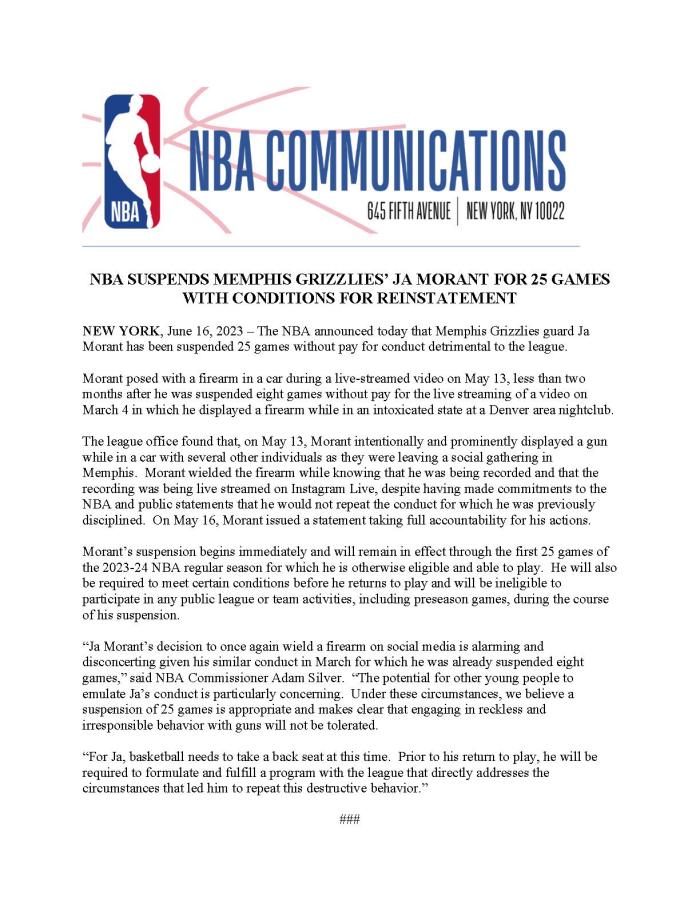 5月16日,莫兰特发布了一份声明,对自己的行为承担全部责任。莫兰特的禁赛立即开始,并将持续到2023-24年NBA常规赛的前25场比赛,他还将被要求在重新参加比赛之前满足某些条件,并且在禁赛期间没有资格参加任何公共联赛或训练活动,包括季前赛。