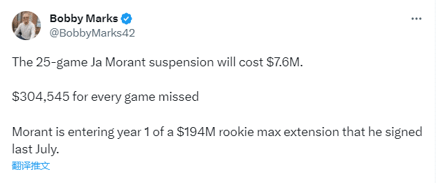 薪资专家Bobby Marks报道,莫兰特将因这25场禁赛损失760万美元,每场304545美元。下赛季,是莫兰特价值1.94亿美元顶薪合同的第一年。