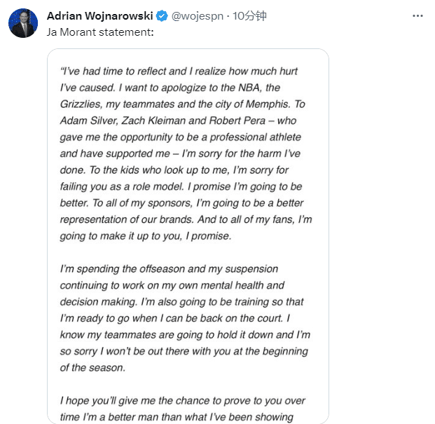 莫兰特公开道歉:我需要反思自己,我意识到自己造成了多大的伤害。我想向NBA、灰熊、我的队友和孟菲斯市道歉。对NBA总裁和球队高管们——他们给了我成为职业运动员的机会并支持了我——我对我造成的伤害感到抱歉。对于那些喜欢我的孩子们,我很抱歉辜负了你们。我保证我会变得更好。对于我所有的赞助商来说,我将更好地代表我们的品牌。对我所有的粉丝们,我保证,我会补偿你们的。我将在休赛期和我的停赛期间继续致力于我自己的心理健康和决策。我还将进行训练,以便在我能够回到球场时做好准备。我现在我的队友们会坚持下去的,很抱歉我不会在赛季初和你们在一起。我希望你能给我一个机会,让我向你证明我是一个比我一直表现得更好的人。