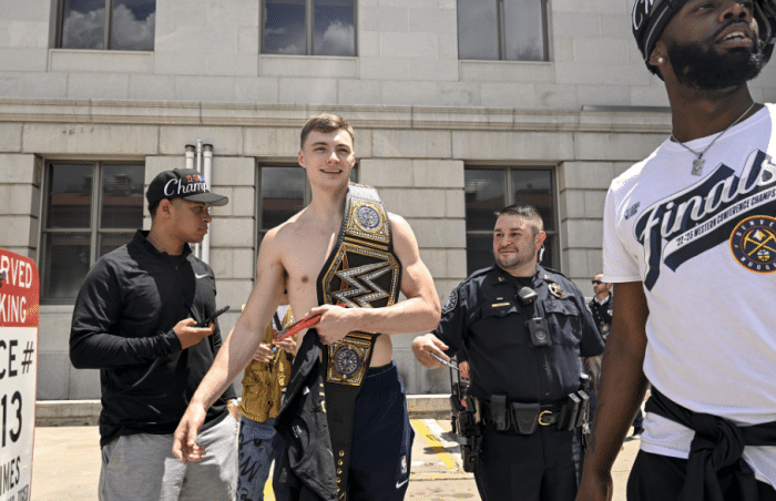 戈登和约基奇跳舞狂欢,布劳恩赤膊扛着WWE金腰带来到现场,杰夫-格林、小布朗、史密斯等人也是光着膀子,其中格林呐喊:这一刻,我已经等了16年!