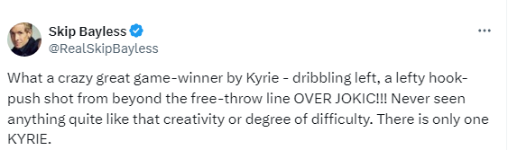 名嘴Skip写道:欧文的绝杀球真的太疯狂了。他用左手运球,在罚球线外面对约基奇的防守,使用一记左手勾射绝杀。我从来没有见过这么有创造力和难度的绝杀球。只有一个凯里-欧文。