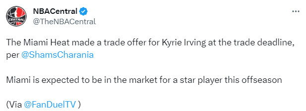 曝热火今夏可能会追求欧文,他们想为巴特勒和阿德巴约寻找冲击总冠军的帮手;值得一的是,巴特勒早就公开表示过他想和欧文一起打球的愿望,也许这就是热火在今年交易截止日追求的欧文原因,可惜热火未能如愿,最终篮网把欧文交易到了独行侠。