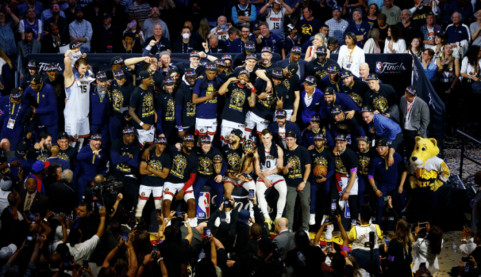 来源:JRS直播网06-13 15:32JRS直播网06月13日NBA总决赛落下帷幕,掘金在G5主场逆转击败热火,大比分4-1拿下队史首座NBA总冠军奖杯。掘金建队47年后夺队史首冠,成目前用时最长的总冠军球队,非常不容易,约基奇首度率队打进总决赛就夺冠,表现强势,他个人以全票的成绩斩获FMVP,实至名归。马龙在颁奖仪式期间表示不满足这一个总冠军,豪气冲天。掘金夺冠,更衣室成为欢乐的海洋。