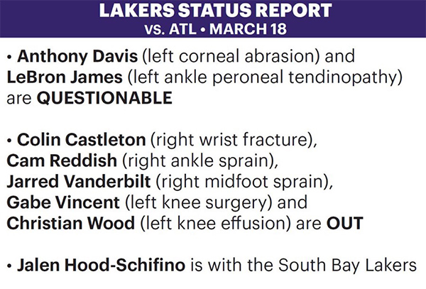 来源:JRS直播网03-18 15:26JRS直播网03月18日讯,湖人官方公布下一场对阵老鹰的伤病报告,浓眉因左眼角膜挫伤被列为出战成疑,詹姆斯(左脚踝)也是可能出战;雷迪什、文森特、卡斯尔顿、伍德、范德比尔特和席菲诺都缺席比赛。