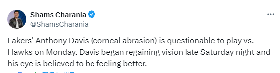 赛后湖人记者报道,浓眉的眼睛肿胀,无法睁开且视力受损,老詹表示浓眉的眼睛就像闭着似的;今日名记shams报道,戴维斯明日对阵老鹰出战存疑,周日深夜他开始恢复视力,据消息源他的眼睛感觉好多了。