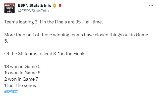 掘金有望今天夺得56年队史首冠,据统计,NBA历史上总决赛出现过36次3-1领先,其中有35次是领先一方夺得总冠军,18次第5场夺冠,15次第6场夺冠和2次第7场夺冠;仅有1次3-1领先被翻盘发生在2016年,当年骑士逆转勇士夺得队史首冠。