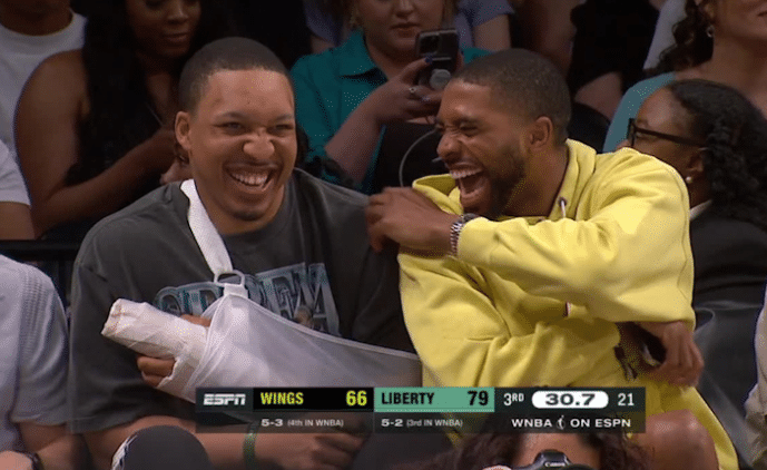 来源:JRS直播网06-12 10:48JRS直播网06月12日,绿军悍将格兰特-威廉姆斯术后亮相,并且和篮网新核布里奇斯一起观看WNBA,两人坐在一起都开怀大笑;其中格威在街头接受采访时,居然嘲讽热火马上就要被掘金淘汰了。