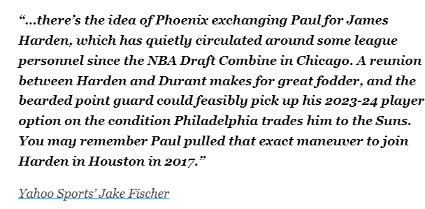 据雅虎记者Jake Fischer报道,自从联盟在芝加哥举行联合试训后,联盟部分人士传言太阳想用保罗交易哈登的想法,哈登和杜兰特的重聚是一个很好的素材;哈登可以在76人将他交易去太阳之后再执行自己2023-24赛季价值3564万的球员选项,2017年保罗就是用这种做法加盟火箭联手哈登的。