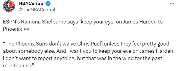 据美媒NBA Central报道,名记Ramona Shelburne表示哈登有可能加盟太阳,过去一个月,哈登和太阳一直联系在一起。