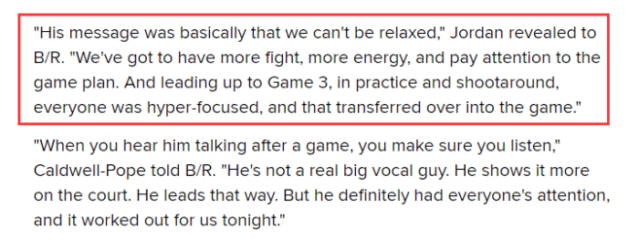 G3赛后谈到此事,小乔丹表示:这让我们都大吃一惊,这太出乎意料了。当约基奇讲话时,每个人都十分专注,我总是把他比作邓肯这样的人,他从来都不吵闹,但他说话时很有说服力,我一直强调他要更加直言不讳,这对我们球队有好处。