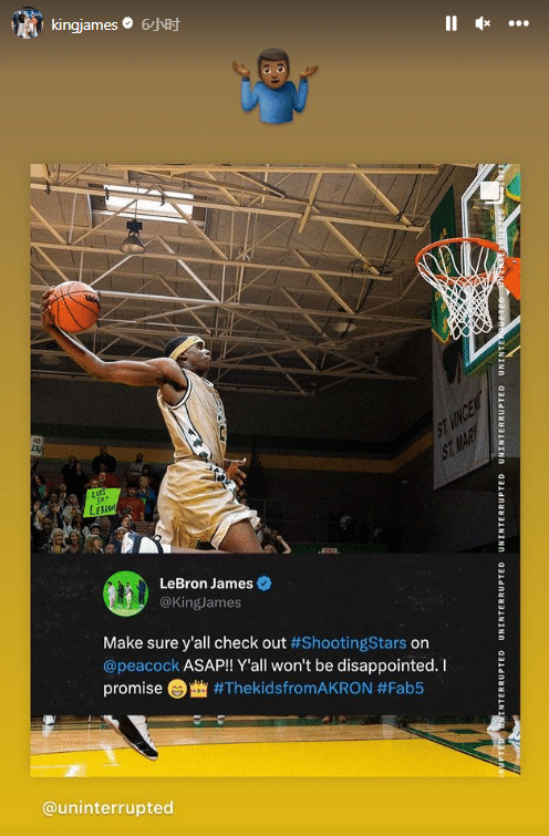 不久前,詹姆斯更新社交媒体,继续宣传自己的纪录片《ShootingStars》,而且晒出自己满脸笑容的画面;流言总会不攻自破,詹姆斯更是早已习惯了各种流言。
